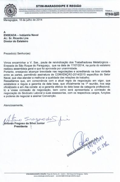 O Sindicato dos Metalúrgicos de Maragogipe apresentou a pauta de reivindicação 2014/2015 aos trabalhadores, em assembleia realizada no último dia 17. Os funcionários do Estaleiro Enseada do Paraguaçu (EEP) lotaram a assembleia, como demonstração de unidade da categoria nesta importante Região do Recôncavo Baiano.