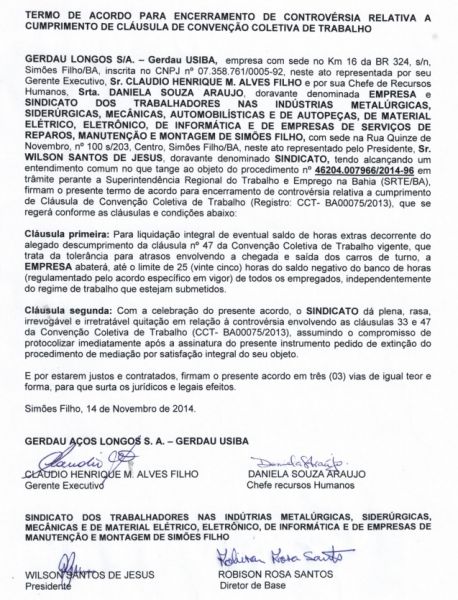 Após várias rodadas de negociação com a Gerdau, mediadas pela Superintendência Regional do Trabalho e Emprego, a pedido do Sindicato dos Metalúrgicos de Simões Filho, foi fechado um acordo sobre o descumprimento das cláusulas de tolerância para atrasos e chegada dos carros de turnos, fato reconhecido pela empresa.