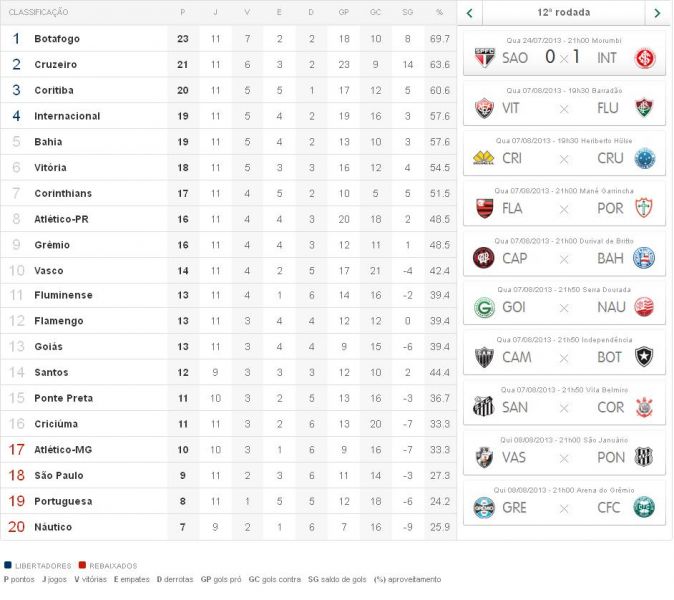 Veja abaixo a tabela do Brasileirão 2013 e os jogos da rodada de hoje.