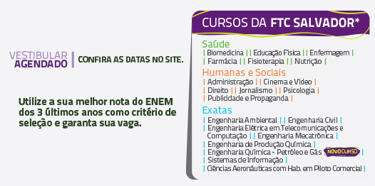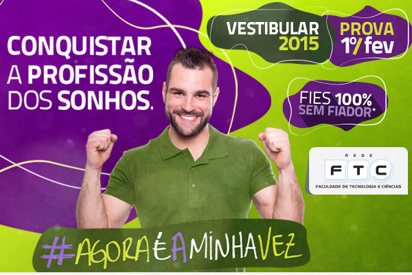 Se você não pode comparecer na data do Vestibular Tradicional, você ainda tem a opção do Vestibular Agendado. Com ele, você pode escolher o dia e a hora para fazer a prova, de acordo com a sua disponibilidade. Basta acessar o site www.ftc.br e fazer a sua inscrição.