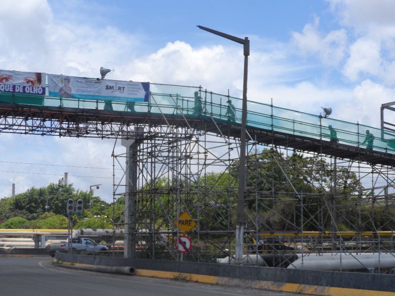 Ao descer dos ônibus, os trabalhadores passam por uma passarela de andaime, que não possui cobertura, improvisada para esse acesso, sem nenhum tipo de proteção contra sol ou chuva.