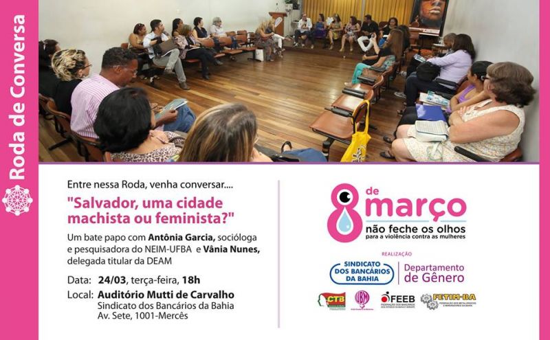 Trabalhadoras participam de mais uma edição do projeto Roda de Conversa, nesta terça-feira (24), no auditório do Sindicato dos Bancários da Bahia. O tema é “Salvador, uma cidade machista ou feministas?”. O debate conta com a presença de Antônia Garcia, socióloga e pesquisadora do NEIM-UFBA, e Vânia Nunes, delegada titular da DEAM.O evento tem apoio da CTB, UBM e da secretaria da Mulher da Fetim (Federação dos Metalúrgicos da Bahia).