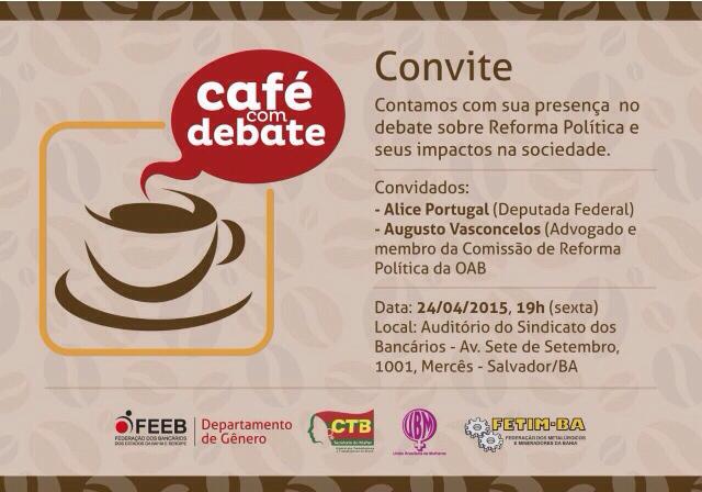 A Federação dos Metalúrgicos da Bahia e a Federação dos Bancários da Bahia Sergipe promovem mais uma edição do projeto “Café com Debate”. No próximo dia 24, o evento reúne discute a Reforma Política e seus impactos para a sociedade. Nesta edição, o projeto conta com a participação de Augusto Vasconcelos, advogado e membro do Conselho de Reforma Política da OAB, e da deputada federal Alice Portugal (PCdoB). A atividade acontece na sede dos Sindicato dos Bancários da Bahia, a partir das 19h.