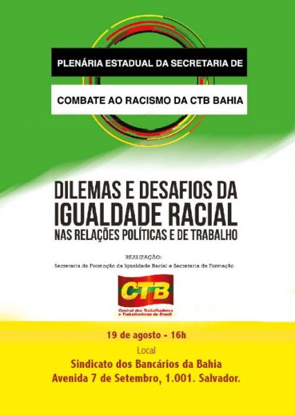 Lideranças sindicais classistas de toda a Bahia se reunirão na próxima quarta-feira (19/8), em Salvador, para a Plenária Estadual da Secretaria de Combate ao Racismo da CTB. O encontro começa às 16h, no auditório do Sindicato dos Bancários, nas Mercês.