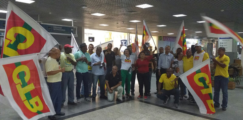 Dirigentes de diversos sindicatos filiados CTB Bahia fizeram uma manifestação no aeroporto internacional de Salvador, na manhã desta quarta-feira (14/10), para protestar contra uma emenda ao Programa de Preservação do Emprego (PPE), que prevê a prevalência do acordado sobre o legislado nas relações trabalhistas.