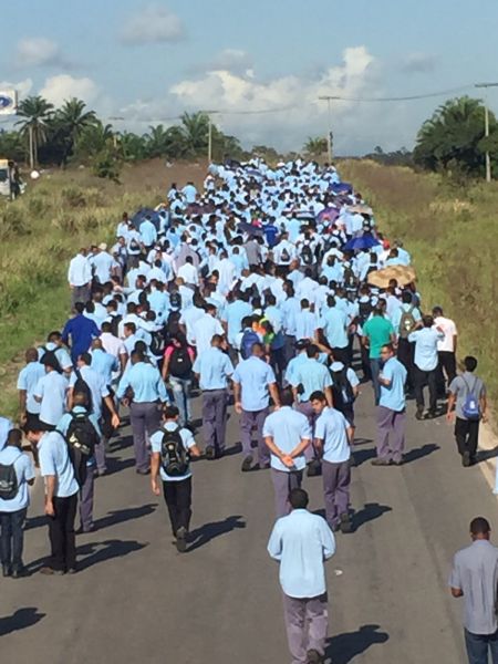 Milhares de trabalhadores do Complexo Ford cruzaram os braços por 24 horas nesta terça-feira (20), em Camaçari, após a empresa anunciar um processo de demissão que pode alcançar cerca 1,5 mil funcionários. Eles desceram dos ônibus em frente à montadora e saíram em caminhada até a Cidade do Saber, onde o governador Rui Costa e representantes da Ford Brasil se reúnem para o lançamento de um programa educacional envolvendo jovens.