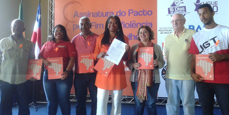 Agora é oficial. As centrais sindicais CTB, CUT, UGT, Força e Nova Central assinaram o Pacto de Enfrentamento à Violência contra a Mulher na Bahia. O acordo foi firmado com a Secretaria de Políticas para as Mulheres do Governo dda Bahia e tem validade de dois anos. O evento faz parte da programação de atividades da Campanha dos 16 Dias de Ativismo pelo Fim da Violência contra a Mulher.