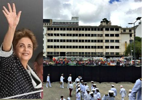 Dilma, ao subir no Navio Doca Multipropósito Bahia, acenou para os manifestantes que gritavam “Não vai ter golpe” Dilma, ao subir no Navio Doca Multipropósito Bahia, acenou para os manifestantes que gritavam “Não vai ter golpe”