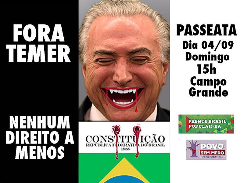 Reunidas na tarde desta quinta-feira (01/09), em Salvador, as seções Bahia da Frentes Brasil Popular e Povo Sem Medo aprovaram novas manifestações Pela Volta da Legalidade Democrática, Fora Temer! A primeira atividade será uma caminhada do Campo Grande ao Farol da Barra, no domingo, 4 de setembro. A concentração será às 15h, no Campo Grande.