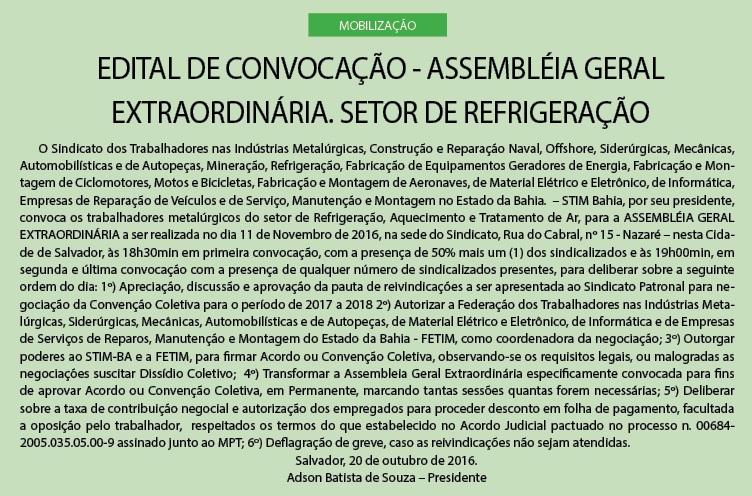 O Sindicato dos Metalúrgicos da Bahia convoca os trabalhadores do setor de Refrigeração para assembleia marcada para o dia 11 de novembro, a partir das 19h, na sede da entidade, no bairro de Nazaré, em Salvador.