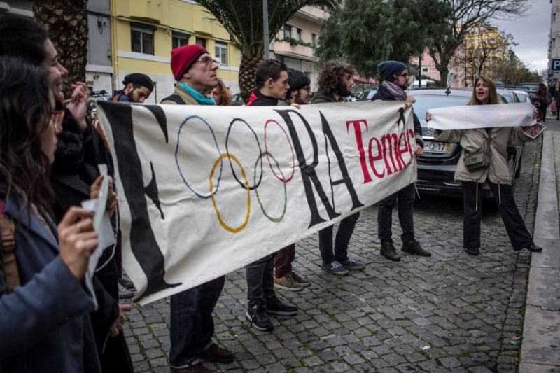 O presidente ilegítimo, Michel Temer, foi recebido por manifestantes na manhã desta terça-feira (10) quando se deslocava de seu hotel para o velório do ex-presidente português, Mário Soares, em Lisboa. Cerca de 20 manifestantes do Coletivo Andorinha, da Frente Democrática Brasileira de Lisboa, se posicionaram em frente ao Hotel Ritz por volta das 9 horas da manhã (horário local), segurando cartazes com dizeres “Fora Temer” e “golpista” e gritando palavras de ordem.