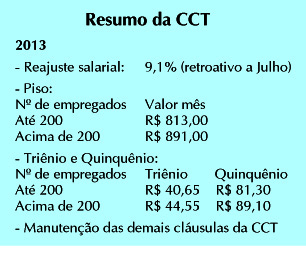 Outro avanço é o novo piso, que teve reajuste de 11,36% (4,1% de aumento real). Agora, o valor ficou em R$ 813,00 nas empresas com até 200 funcionários, e R$ 891,00 nas empresas com mais de 200 trabalhadores. Além disso, todas as cláusulas da Convenção Coletiva anterior foram mantidas.