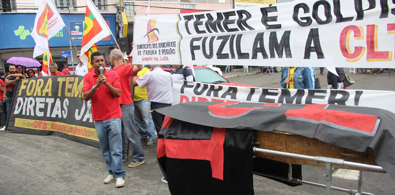 Enquanto ocorria a votação da Reforma Trabalhista no Senado, na terça-feira 11, militantes da CTB, CUT, Frente Brasil Popular, Levante da Juventude e sindicatos realizaram uma caminhada fúnebre pela Avenida Cinquentenário, em Itabuna/Ba, denunciando o que representa a aprovação da nefasta reforma: o fim dos diretos trabalhista, o enterro da CLT (Consolidação das Leis Trabalhistas). Com direito a caixão e Marcha Fúnebre (de Chopin), o cortejo chamou a atenção de trabalhadores e transeuntes.