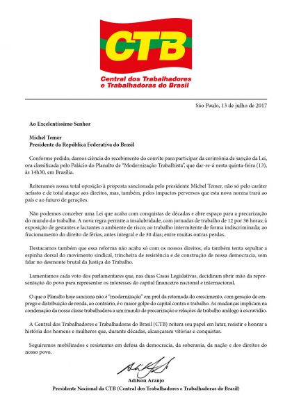 A presidência da República encaminhou na manhã desta quinta-feira (13) um convite ao presidente da CTB, Adilson Araújo, para participar da cerimônia de sanção da lei que altera mais de cem artigos da CLT e impõe um retrocesso sem precedentes aos direitos da classe trabalhadora no Brasil.
