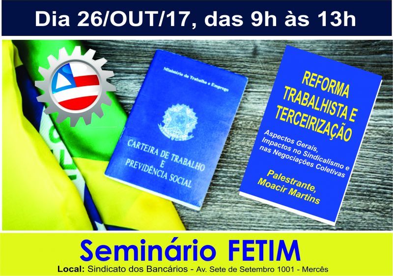 Os prejuízos e atrasos causados pela mudança na legislação do trabalho centralizam as discussões do seminário promovido pela FETIM (Federação dos Metalúrgicos e Mineradores da Bahia) nesta quinta-feira (26), das 9h às 13h, no Sindicato dos Bancários da Bahia, nas Mercês, Centro de Salvador.