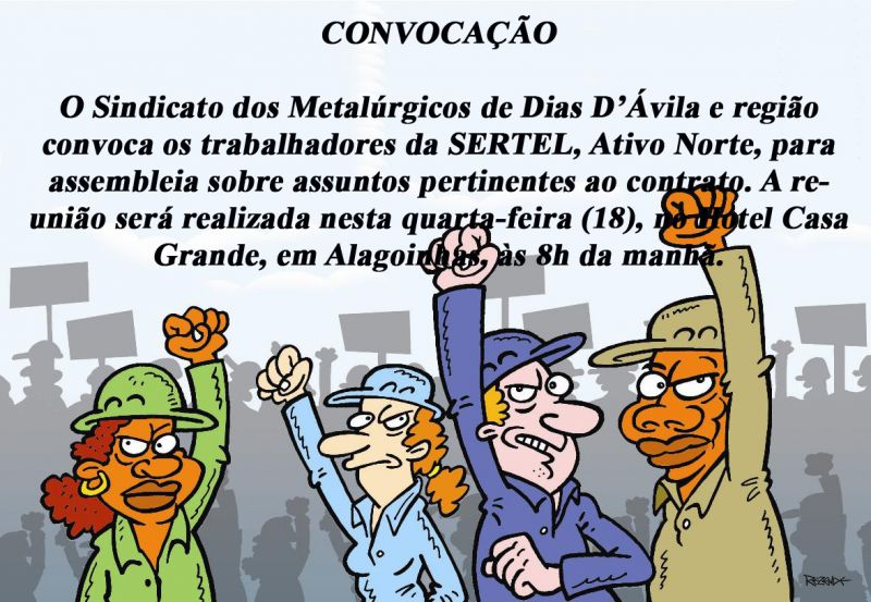 O Sindicato dos Metalúrgicos de Dias D’Ávila e região convoca os trabalhadores da SERTEL, Ativo Norte, a participarem da assembleia onde trataremos dos assuntos pertinentes ao contrato. A reunião será realizada nesta quarta-feira (18), no Hotel Casa Grande em Alagoinhas, às 08h da manhã.
