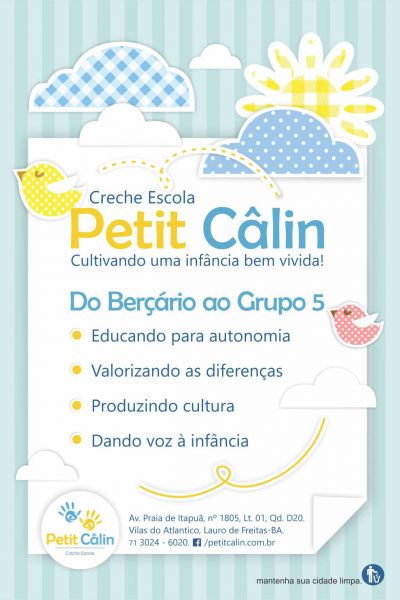 Situada em Lauro de Freitas, a Petit Câlin atua no mercado desde 2012, oferecendo educação integral de crianças na primeira infância, de modo a ampliar a qualidade de vida dos pequenos e de suas famílias.