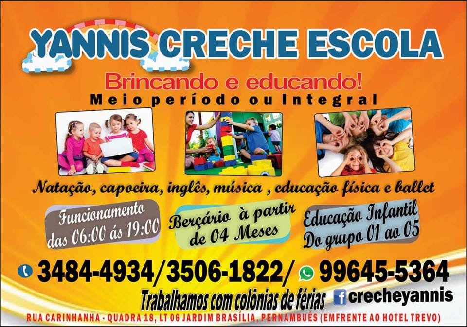 A Yannis oferece tempo integral,semi integral ou meio período, além de aulas de natação, ballet, inglês, capoeira, música e educação física, para entreter e educar crianças de 04 meses até 05 anos de idade.