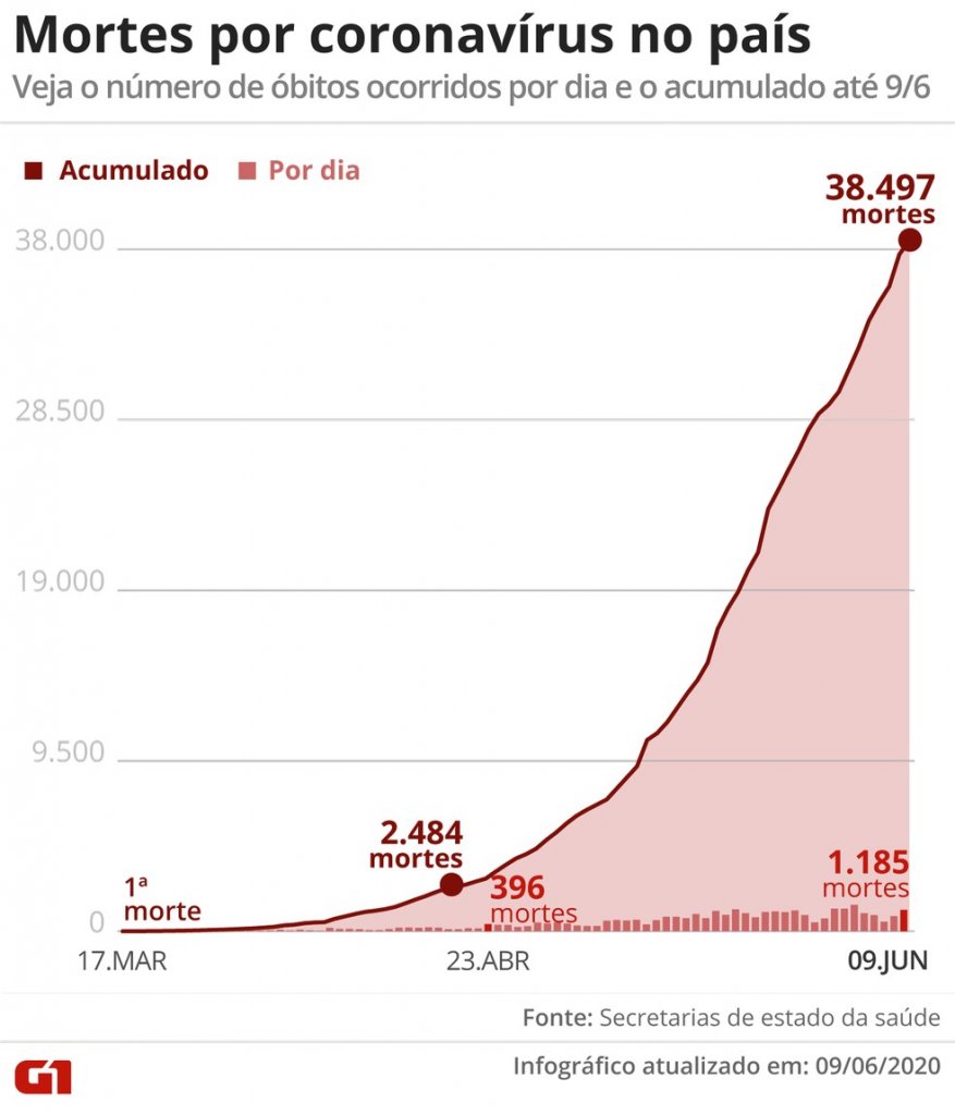 Mortes por coronavírus no acumulado e por dia no Brasil até 9 de junho — Foto: Editoria de Arte/G1