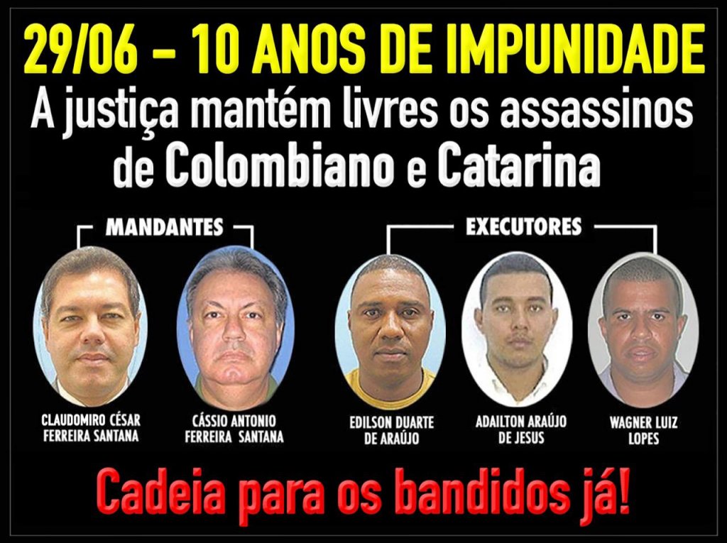 No dia 29/06 (segunda-feira), chegamos a 10 anos do cruel e brutal assassinato de nossos entes queridos Paulo Colombiano e Catarina Galindo. A investigação policial concluiu, com provas robustas, que os mandantes do crime foram os irmãos Claudomiro e Cássio Santana, tese corroborada pelo Ministério Público da Bahia. O motivo do crime é conhecido: Paulo Colombiano tinha sugerido rever o contrato do plano de saúde do Sindicato dos Rodoviários da empresa Mastermed, de propriedade dos acusados, considerado por ele lesivo aos interesses da categoria. Os executores identificados foram os funcionários dos irmãos, Edilson Duarte de Araújo, Adailton de Jesus e Wagner Luiz Lopes.