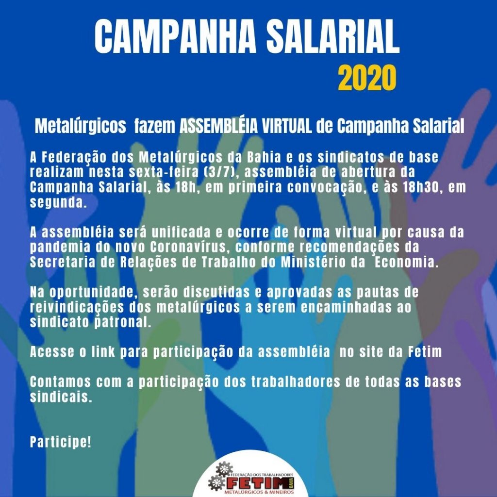 A Federação dos Metalúrgicos da Bahia e os sindicatos de base realizam nesta sexta-feira (3/7), assembléia de abertura da Campanha Salarial, às 18h, em primeira convocação, e às 18h30, em segunda.