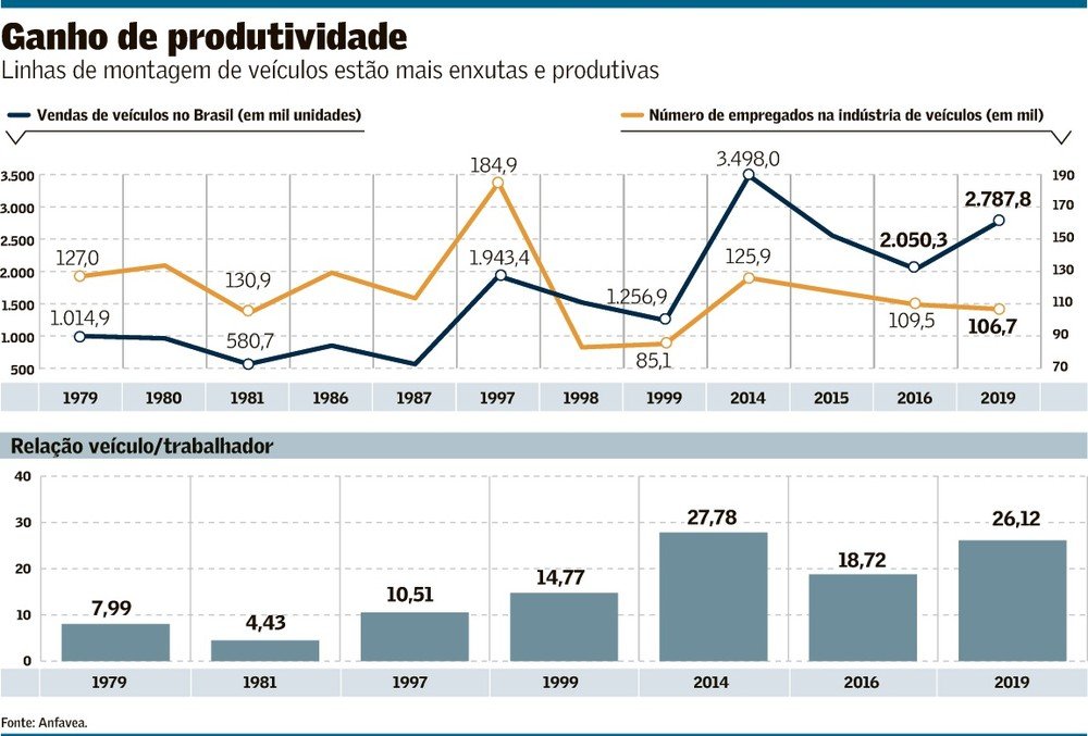 As crises ajudam a acelerar um processo provocado pelo aumento da automação. A última crise no setor foi entre 2014 e 2016. No ano seguinte, a produção voltou a acelerar, mas o nível de emprego não seguiu o mesmo ritmo. Entre o fim de 2013 e fim de 2019, mais de 28 mil vagas foram eliminadas nas fábricas de veículos, que hoje empregam 104 mil.