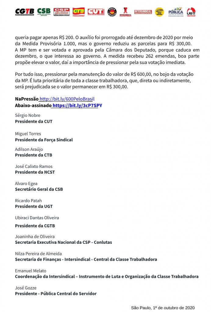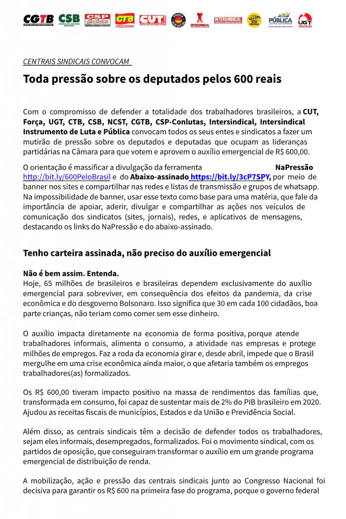 "Com o compromisso de defender a totalidade dos trabalhadores brasileiros, a CUT, Força, UGT, CTB, CSB, NCST, CGTB, CSP-Conlutas, Intersindical, Intersindical Instrumento de Luta e Pública convocam todos os seus entes e sindicatos a fazer um mutirão de pressão sobre os deputados e deputadas que ocupam as lideranças partidárias na Câmara para que votem e aprovem o auxílio emergencial de R$ 600,00."