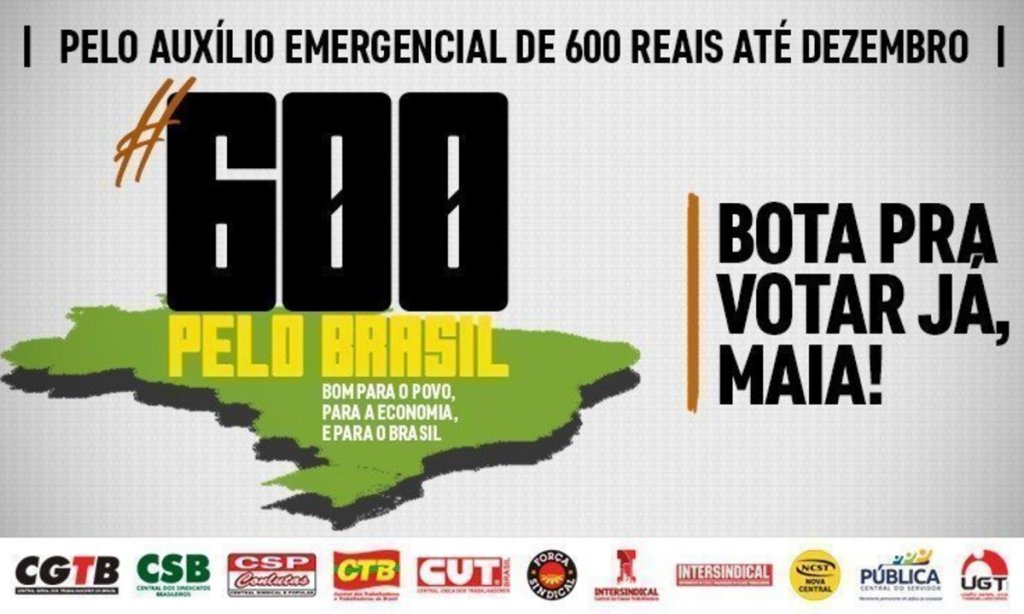 Centrais sindicais lançaram a campanha “600 Pelo Brasil”, com o objetivo de pedir ao Rodrigo Maia (DEM), presidente da Câmara dos Deputados, mantenha o auxílio emergencial no valor de 600 reais até dezembro.