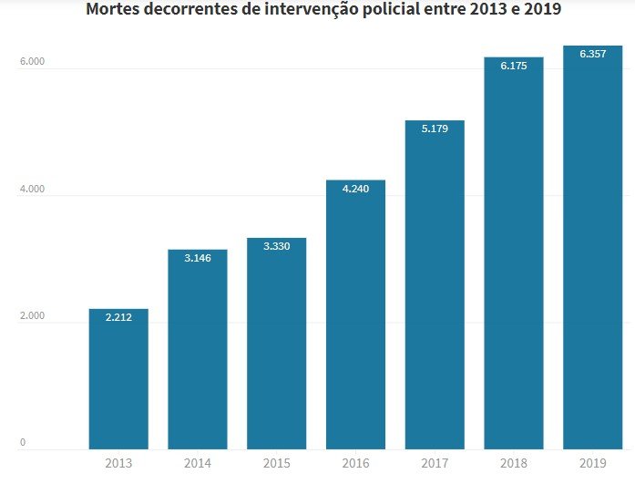 Oito a cada dez pessoas mortas pela polícia em 2019 eram negras segundo o Anuário Brasileiro de Segurança Pública 2020.