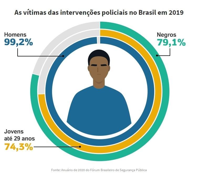 Em 2019, 74,4% das 39.561 vítimas de homicídio eram negros. O índice sobe, para 79,1% quando o autor do assassinato foi um policial. Para Amanda Pimentel, pesquisadora do FBSP, a matança de negros pelas forças policiais é algo que virou parte da cultura policial.