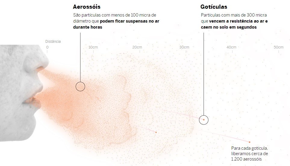 Na primavera do hemisfério norte, as autoridades sanitárias ignoraram essa via de contágio, mas recentes publicações científicas obrigaram a Organização Mundial da Saúde (OMS) e os CDC a reconhecer esse risco. Um artigo da revista Science fala de evidências “esmagadoras”, e os CDC afirmam que, “sob certas condições, pessoas com covid-19 poderiam ter infectado outras que estavam a mais de dois metros de distância. Essas transmissões ocorrem dentro de espaços fechados com ventilação inadequada. Em alguns casos, a pessoa infectada respirava com intensidade, por exemplo ao cantar ou se exercitar”.