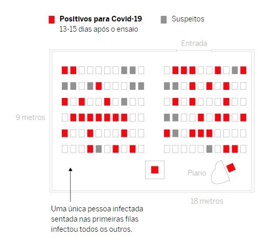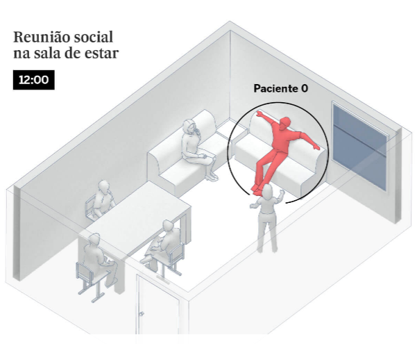 Os cálculos mostrados nos três cenários se baseiam em estudos sobre como ocorrem as transmissões por aerossóis, com contágios reais que puderam ser analisados em detalhe. Um caso de grande utilidade para entender a dinâmica de contágio em espaços fechados foi vivido durante um ensaio de um coral no Estado de Washington (EUA) em março. Apenas 61 dos 120 membros do coral compareceram ao ensaio e tentaram manter distância e higiene. Sem saber, provocaram um cenário de máximo risco: sem máscaras, sem ventilação, cantando e dividindo espaço por muito tempo. Um único portador do vírus, o paciente zero, contagiou 53 pessoas em duas horas e meia. Alguns dos infectados estavam 14 metros atrás dele, de modo que somente os aerossóis podem explicar o contágio. Dois dos doentes morreram.