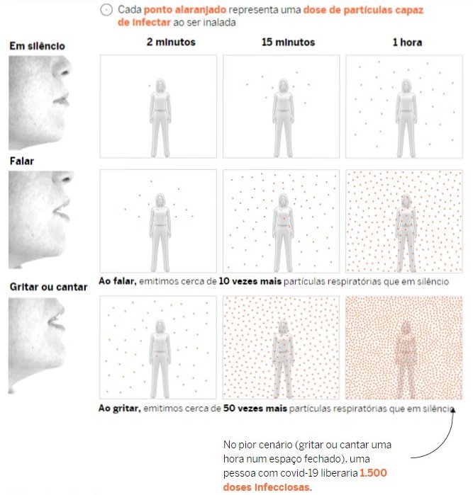 No início da pandemia, teve-se a impressão de que o principal veículo de contágio eram essas grandes gotas que lançamos ao tossir ou espirrar. Mas agora sabemos que gritar e cantar num espaço fechado, mal ventilado e por muito tempo também gera um alto risco de transmissão. Isso acontece porque, ao falarmos a plenos pulmões, lançamos 50 vezes mais partículas carregadas de vírus do que em silêncio. Se não forem diluídos com a ventilação, esses aerossóis se concentram com o passar do tempo, aumentando o risco de contágio. Os cientistas demonstraram que essas partículas, que também liberamos ao respirar ou com máscaras mal ajustadas, podem ser contagiosas a cinco metros de um doente e durante muitos minutos, dependendo das condições. Essas são as condições que reproduzimos nestes exemplos e que convém evitar a todo custo.
