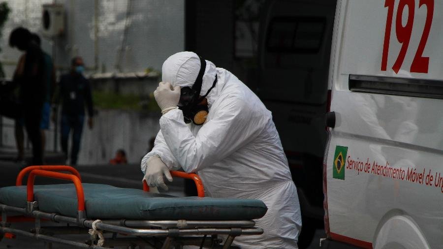 Profissional do Samu aguarda atendimento com paciente com covid-19 dentro da Ambulância na frente do Hospital e Pronto Socorro 28 de Agosto, em Manaus (AM)