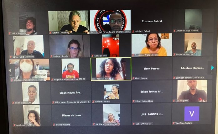 Representantes de seis partidos (PT, PSB, PCdoB, PSOL, PCO e PDT), de cinco centrais sindicais (CUT, CTB, Intersindical, CSP Conlutas e UGT), além de integrantes de movimentos sociais e coletivos de trabalhadores e servidores públicos se reuniram na noite desta quinta-feira (23), de forma virtual, e decidiram marchar juntos na manifestação contra o presidente Jair Bolsonaro (sem partido), que ocorrerá no próximo dia 2 de outubro em todo o Brasil e que em Salvador será no Campo Grande. O encontro foi mediado por Luciana Liberato, do Fórum Baiano de Servidores Públicos e Laíse Neres, que preside o Movimento Negro do PDT de Salvador e contou com a presença das deputadas federais Lídice da Mata (PSB) e Alice Portugal (PCdoB-BA) e dos estaduais, Jacó (PT) e Hilton Coelho (PSOL).