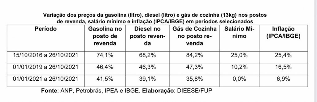 Num recorte de janeiro de 2019 a outubro de 2021, ou seja, período Bolsonaro, observa-se a mesma trajetória de aumentos reais nos preços dos combustíveis: Nas refinarias, as altas foram de 106,6% na gasolina, de 81,4% no diesel, e de 100,5% no gás de cozinha. Nos postos de revenda, a situação se repete: alta de 46,4% na gasolina; de 46,3%, no diesel; e de 47,3%, no gás de cozinha. Nesse período, a inflação foi de 16,5% e o salário-mínimo variou apenas 10,2%, perdendo ainda mais seu poder de compra.