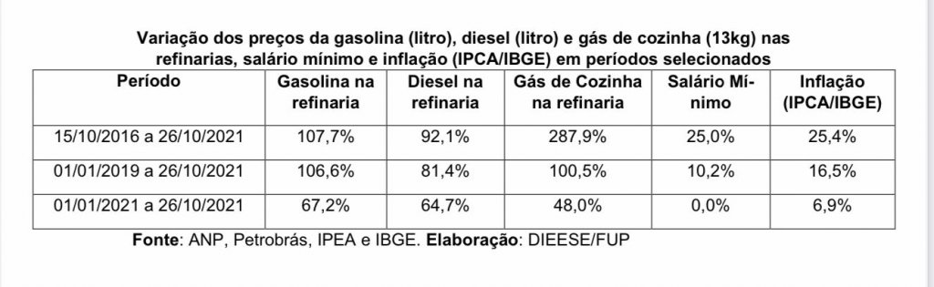 Os dados foram elaborados pelo Departamento Intersindical de Estatística e Estudos Socioeconômicos (Dieese/subseção FUP), com base nas estatísticas oficiais da Petrobrás (refinarias) e da Agência Nacional de Petróleo, Biocombustíveis e Gás Natural (postos).