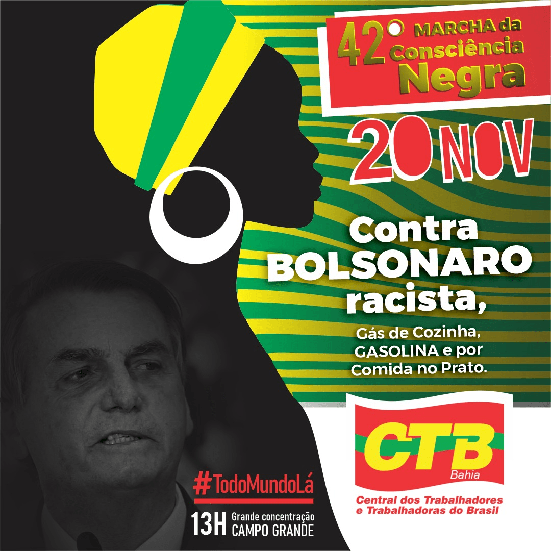 “Não admitimos nenhum tipo de corrupção, não aceitamos essa política burguesa de Paulo Guedes e de Bolsonaro, o povo não tem comida, moradia, não tem um minuto de paz. Vamos todos e todas no 20 de novembro, se empoderar da representatividade de Zumbi e nos unir em prol dos direitos da classe trabalhadora. Queremos o país unido pelas pautas fundamentais da vida da população negra desse país, que é a grande maioria. É hora de unificar, falou Rosa de Souza, presidenta da CTB-BA.