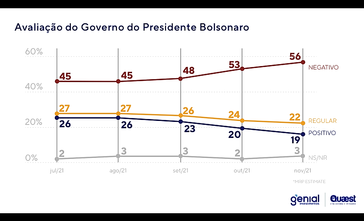A desaprovação ao governo Jair Bolsonaro cresceu a tal ponto que tem reduzido sensivelmente as chances de reeleição do presidente. Conforme pesquisa Genial/Quaest divulgada nesta quarta-feira (10), a avaliação negativa do governo subiu de 53% em outubro para 56% neste mês de novembro, enquanto a aprovação variou de 20% para 19% no mesmo período. Hoje, segundo o levantamento, 67% dos brasileiros não votariam em Bolsonaro de jeito nenhum.