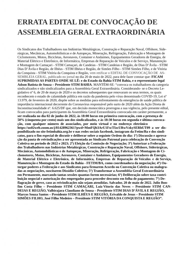 A categoria Metalúrgica realizará Assembleia de abertura de campanha salarial, data base julho 2022, na próxima quinta, 02/06, conforme edital publicado pela Federação e os Sindicatos.