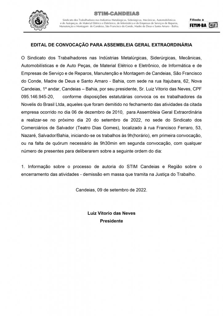 A assembleia tem o objetivo de passar informações sobre o processo de autoria do STIM Candeias e Região, sobre o encerramento das atividades - demissão em massa que tramita na Justiça do Trabalho.