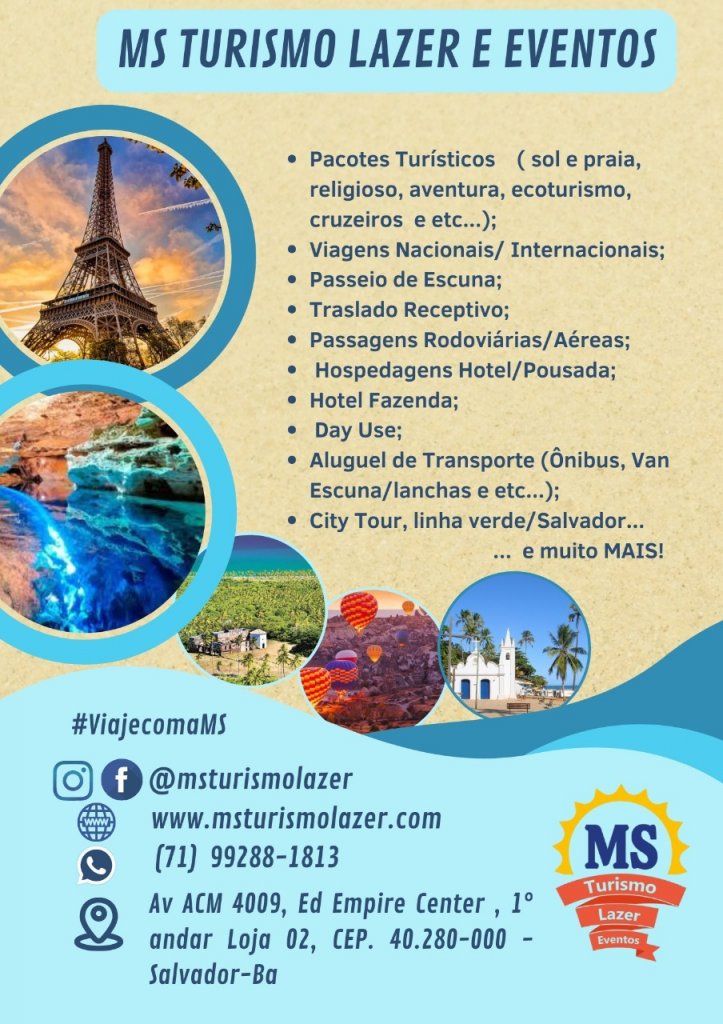 Há 13 anos atuando no seguimento de Turismo, Lazer e Eventos, a MS tem pacotes e opções para todas as idades. A agência oferece aos sindicalizados de 10 a 15% de desconto em seus produtos e tem ótima condições de parcelamento. Abaixo, algumas opções de viagens, eventos, etc. Para saber mais, entre em contato pelo whatsapp 71 99288-1813 ou visite sua página no Instagram: @msturismolazer.