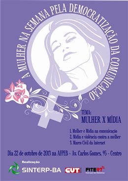 Contamos com a sua presença no debate "A Mulher na Semana Nacional pela Democratização da Comunicação", que acontecerá no dia 22 de outubro, das 14h às 18h, na Sede da Associação dos Funcionários Públicos ( Rua Carlos Gomes, 92), quando discutiremos os seguintes temas: Mulher e Mídia na Comunicação; Mídia e Violência contra a Mulher e Marco Civil da Internet. Já está confirmada a participação de Marjorie Moura, do SINJORBA; Marinalva Nunes, da FETRAB, Julieta Palmeira, secretária de comunicação do PC do B e Vera Carvalho, da CUT. O evento será de grande utilidadepara todos os que desejarem debater a situação da mulher e a Comunicação, tema que nos atinge profundamente nos dias de hoje. Você não pode perder, reserve a sua tarde de terça -feira para participar do evento!