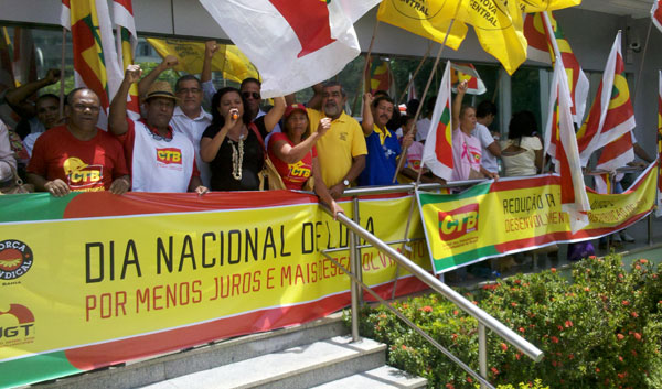 Trabalhadores e dirigentes sindicais da CTB fizeram uma grande manifestação na manhã desta terça-feira (26/11), em Salvador, para cobrar a redução da taxa básica de juros da economia e a geração de mais empregos, com melhor distribuição de renda. O ato, realizado conjuntamente com a Nova Central Sindical, aconteceu em frente ao Banco Central, na avenida Garibaldi.