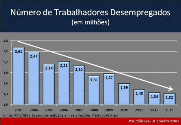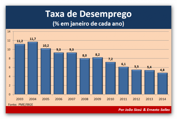 João Sicsú sinalizou que “entre 2003 e 2013 o número de trabalhadores desempregados foi reduzido em 50%. Eram 2,6 milhões, hoje são 1,3 milhão". E mais, ele lembrou que “essa é menor taxa para o mês de janeiro desde que a série teve início em 2002 (ver gráfico acima)".